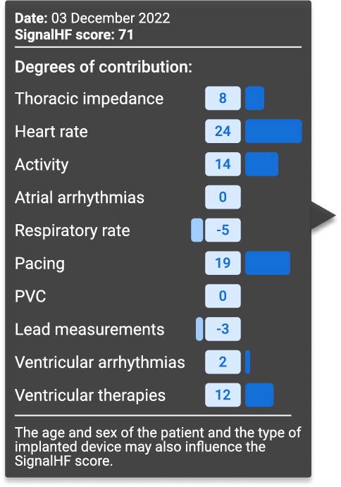 The SignalHF HF Score is intended to calculate the risk of HF for a patient in the next 30 days. This System is intended for adjunctive use with other physiological vital signs and patient symptoms and information and is not intended to independently direct therapy. See the instructions for use for more information. SignalHF is not available for sale in Europe.