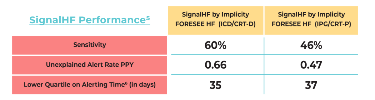 ¹SignalHF FDA cleared Class II medical device. Manufacturer: Implicity. The SignalHF System is intended for use by qualified healthcare professionals (HCP) managing patients over 18 years old who are receiving physiological monitoring for Heart Failure surveillance and implanted with a compatible Cardiac Implantable Electronic Devices (CIED) (i.e., compatible pacemakers, ICDs, and CRTs). The SignalHF System provides additive information to use in conjunction with standard clinical evaluation.